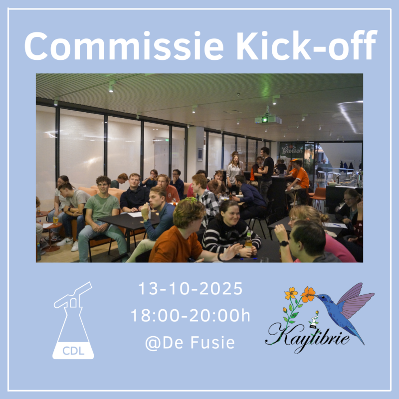 Maandag 13 oktober houden we een Kickoff activiteit om alle commissies het nieuwe jaar in te wijden. We zouden het ontzettend leuk vinden om dit samen met jullie te doen. Je kan ook een frietje en vega snack (vega kipcorn of vega kroket) mee bestellen tot 16:00 uur op 13 oktober. Dit kost 5,00 euro.