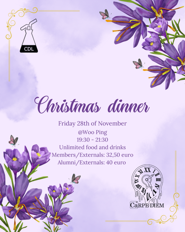 Dit diner is voor iedereen: alumni, externe gasten, leden en vrienden! Kom en vier de gezelligheid met ons mee! ?De eerste 60 leden krijgen korting op het diner, dus registreer snel en verzeker je van een plekje voor dit geweldige event.